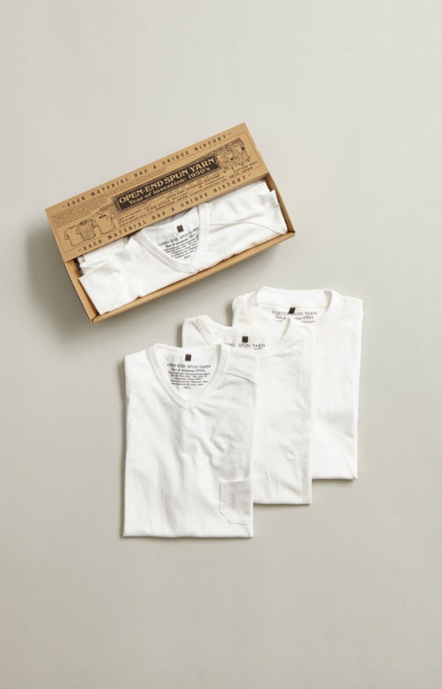 【Nigel Cabourn】 Tシャツはとてもシンプルなアイテムであり、製品もピンからキリまで世の中に溢れています。毎日着用する事も多いので同じものの3枚パック、色違いの3枚パックなども売られています。そこで私たちも3枚パックのTシャツを開発する事にしました、私たちの製品のほとんどはオリジナルのファブリックを使用し、ファブリックの基になる糸そのものが既存品で目的にかなわない場合は、糸造りからスタートするケースが珍しくありません。 このアプローチの真逆は、既成の原反を生地屋さんから購入して、製品に裁断し縫い上げる事。一般的には最も簡単で最もスピーディーなやり方です。 既成の生地で飽き足らない場合は所謂別注生地を織り上げます。既成では存在しない、そのブランドやメーカーだけのオリジナル生地という訳です。ただし、その別注生地にしても糸まで遡ると既成の糸を使用している事がほとんどです。私たちの要望にかなう糸が存在しない場合は、糸自体を作ります。時間のかかるとても大変な行程ですが幸い私たちにとってはそれほど特殊な事ではありません。 そこで、どうせ3枚パックのTシャツを作るのであれば、紡績の違いとそこから導き出される着心地の違いを表現してみようと思い立ちました。綿の糸を分解すると十数ミリの細い毛のようなものになります。これが短繊維。短繊維を一定方向にねじり合わせる事、撚り合わせる事で1本の糸を造ります。こうして糸をつくる行程が紡績です。 現代では、全自動で可動する強大なマシーンが並ぶ紡績工場で糸が生産されますが、機械の出現依然は手作業です。毛羽のような短繊維の方向だけを揃えた脱脂綿状の固まりの中から、手作業で繊維を引きだし糸車に巻き取っていきます。所謂「手紡ぎ(てつむぎ)」と呼ばれる行程です。 【RING SPUN YARN】 手紡ぎの次に、ミュール紡績という極めてプリミティブな手法が発明された後、本格的に機械化したものがリング紡績。登場したのは1830 年代くらい。スライバー(紡績する前の状態で、短繊維の方向だけを揃えた脱脂綿のようなかたまり)を粗く糸状にしたものをローラーで引きだし、ボビンの周りを回転する金属製のリングに通しボビンに巻き取っていきます。この時、ボビン自体も高速で回転するため、両者の動きと速度によって撚糸される仕組みです。いわば最も古い紡績ですが、リング紡は現代に継承され続けています。発明から200年もの時が経過していますので、機械は格段に進化しスピード、精度、品質は飛躍的に進歩しているものの、紡績の原理は発明当初も現代も同じです。普遍的とも言えるその紡績原理そのものを現すように、リング紡績による糸で網上がられたTシャツは、極めてオーソドックスな着心地であり、良い意味で「普通の」タッチを持ちます。 最も古い紡績に合わせて、デザインも1800年代のヴィンテージをベースにしました。 【OPEN-END SPUN YARN】 時代が流れ、1950年代になるとリング紡績の原理とは全く異なる革新的な手法が発明されます。 それが空気紡績。 リング紡は基本的には手紡ぎの「手」を機械に置き換えたものであり、紡績の原理は手紡ぎもリング紡も同様なのに対し、回転する空気のジェット気流で短繊維をねじる事を発明しました。これにより大量にしかもスピーディーに糸を生産する事が可能になりました。空気紡績の原理は、高速で回転する衣類乾燥機を想像してもらうと判りやすいでしょう。旋回する気流に乗った短繊維がより高速により細くなった吹き出し口から糸として撚糸されて出てくるイメージです。空気の渦の中を短繊維が回転しますので、遠心力により糸の外側の密度が増し固くなります。そして糸を輪切りにした際の中心部は外殻に比較して密度があまくなります。すなわち着心地もガサッとした硬さがあります。 糸の断面というミクロの世界の硬さですから、固くて着心地が悪いという事ではありません。適度に固い糸はサラリとした着心地に繋がり密度の詰まった糸の表面は汗を素早く吸収し体から離れる事でそれを放出します。デザインは1950年代のヴィンテージから。 【VORTEX SPUN YARN】 最後に控えるのは、最新のボルテックス紡績。発明はテクノロジー大国、日本。 空紡が、いわば荒っぽく遠心力を伴った空気の旋回で紡績する事に対し、十数ミリの短繊維の挙動を空気の旋回流によって一本一本コントロールしていく事が大きな特徴です。微細なジェット気流に短繊維を載せ、短繊維の先端は糸の中心に向かってほぼ無撚状態で収束し、もう一方の端は糸自身の外殻に潜り込むようにねじり合わされます。これにより糸自体の型くずれが劇的に解消され、極限まで毛羽を抑え込む事で非常になめらかな肌触りの糸が出来ます。これは日本の最新技術でしか生み出し得ない糸の着心地です。デザインも最も現代に相応しいものに仕上げました。 3種類の紡績によりそれぞれ異なった特徴を持つ着心地とデザインをどう