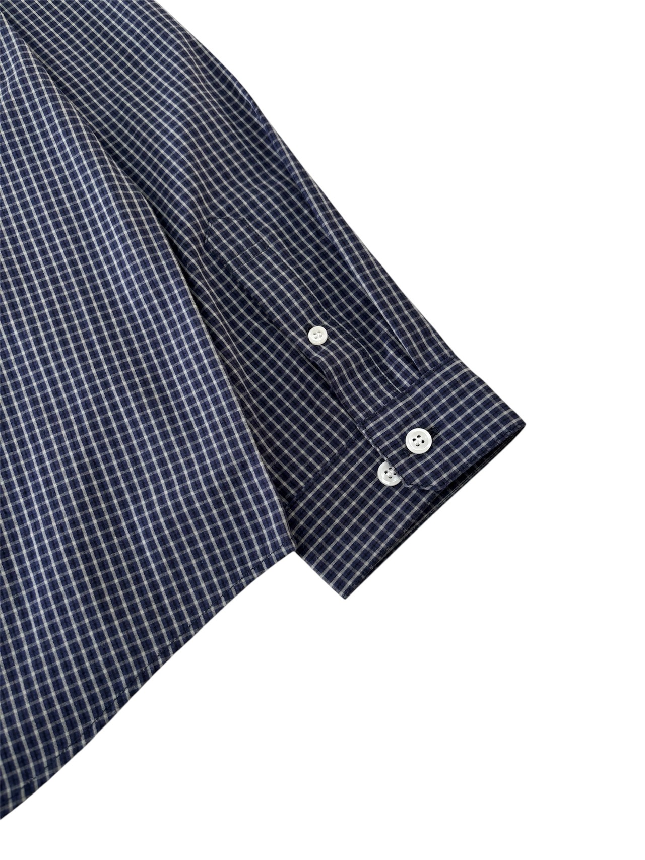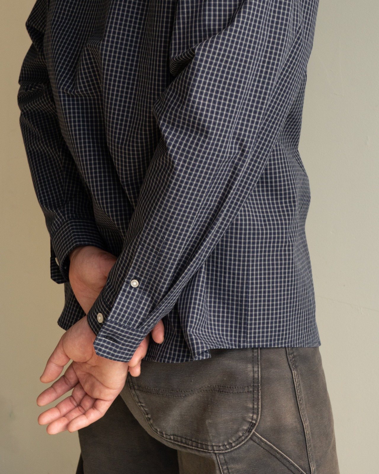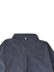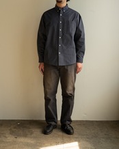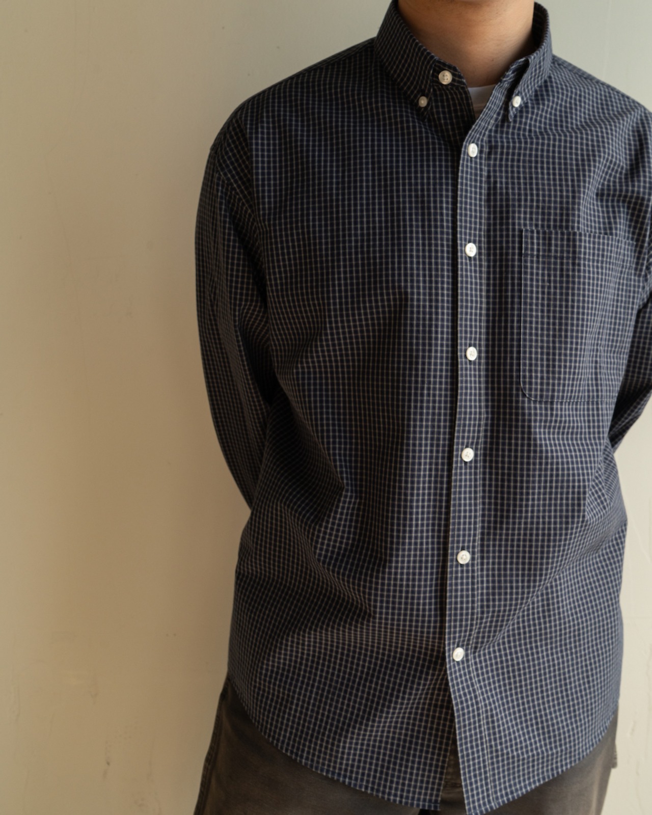 一般的な BD シャツよりもかなり低めに設定した台衿と衿、そして短い剣先によって BD シャツにしかない凛とした佇まいを保ちつつも程よくカジュアルダウン。