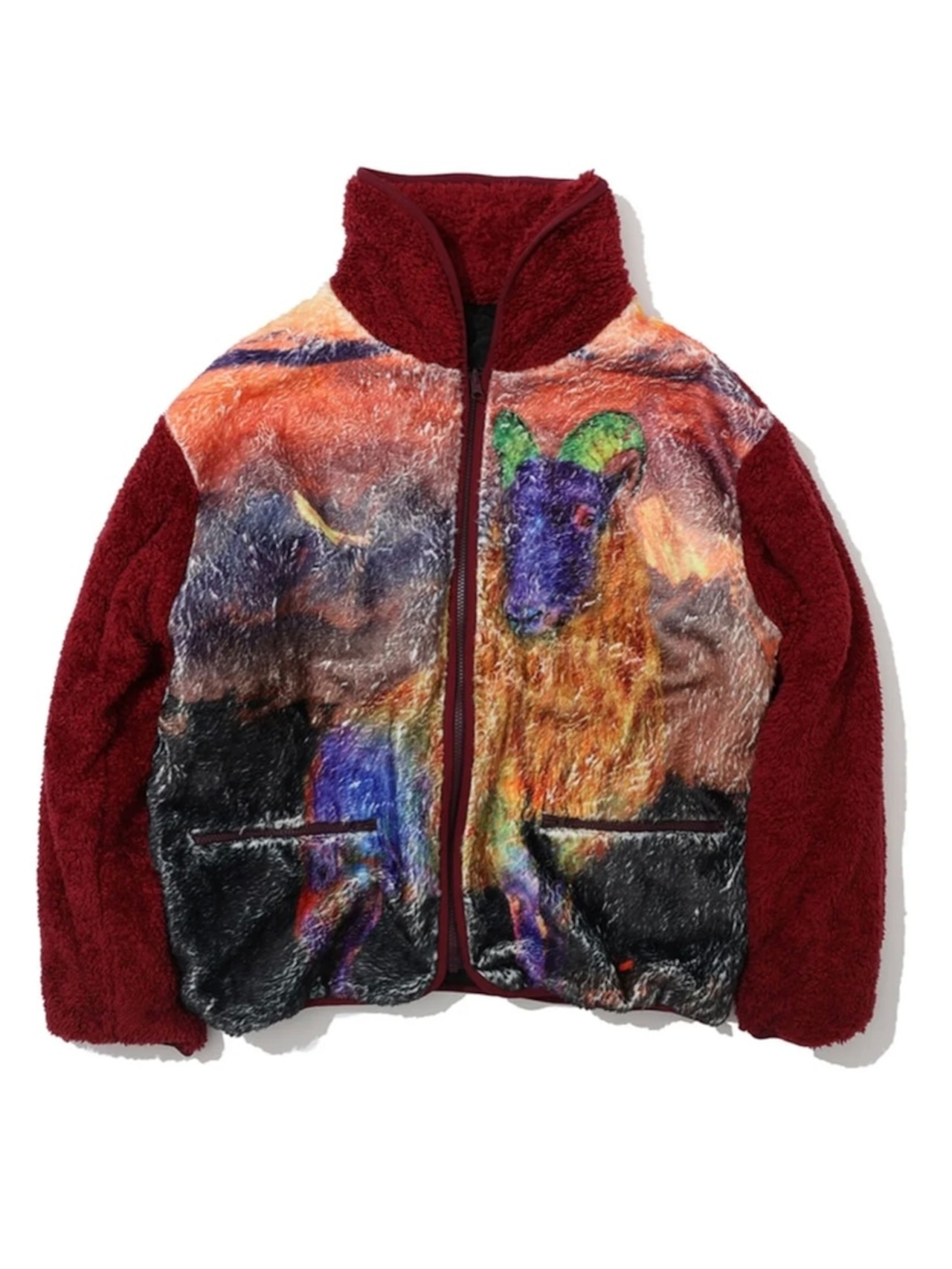 毛足の長い軽量ボアフリースを使用した、ゆったりシルエットのフリースジャケット。保温性に優れたフリース面には、シーズナルモチーフである“ヒマラヤタール”をホーリーカラーで大胆にインクジェットプリントし、冬の装いに遊び心と存在感をプラスしました。