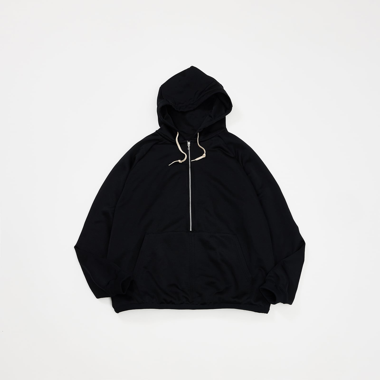 シンプルなハーフジップフーディー。 表地は光沢のあるポリエステル生地に、裏地はコットン裏毛。
