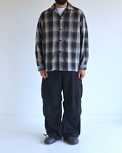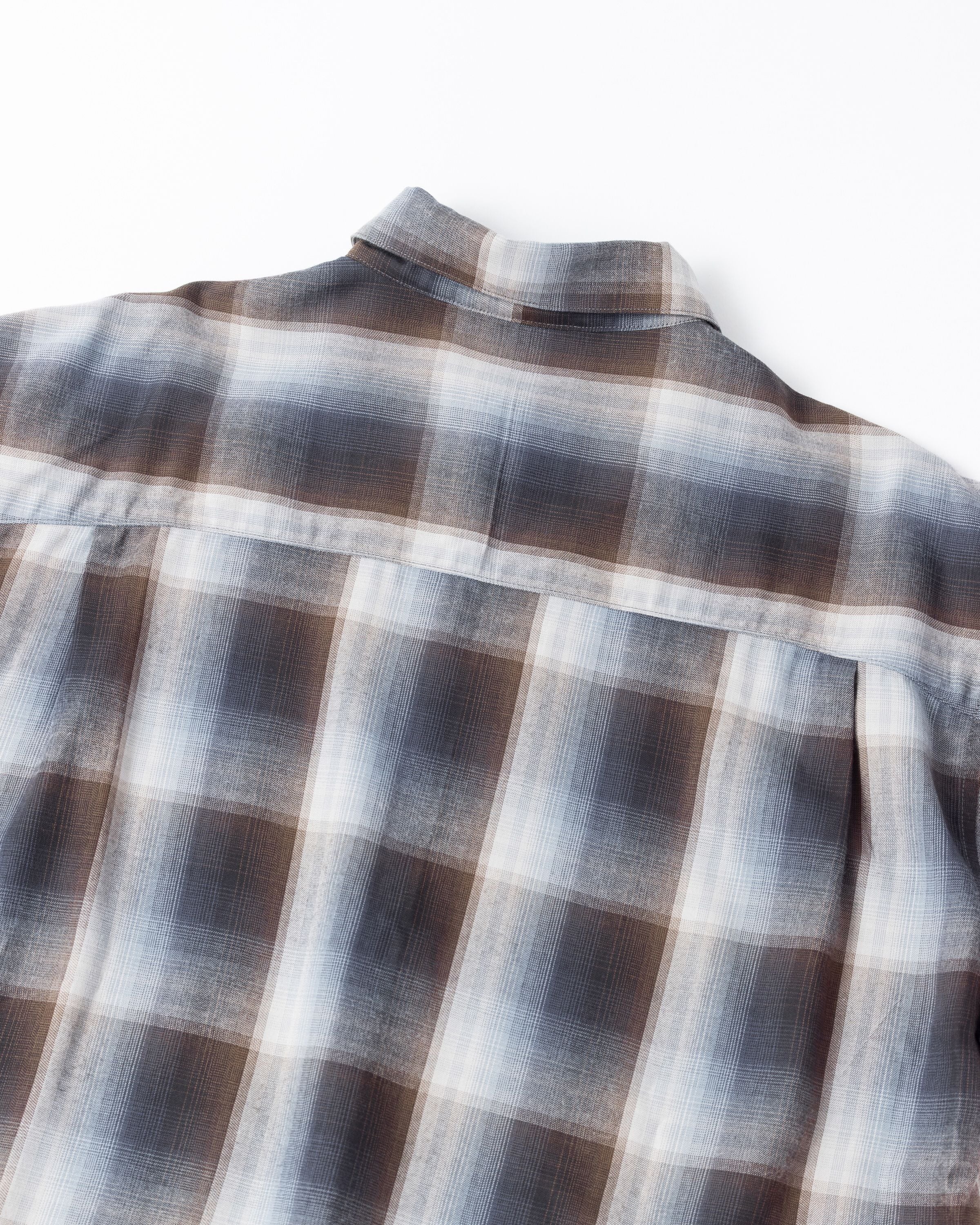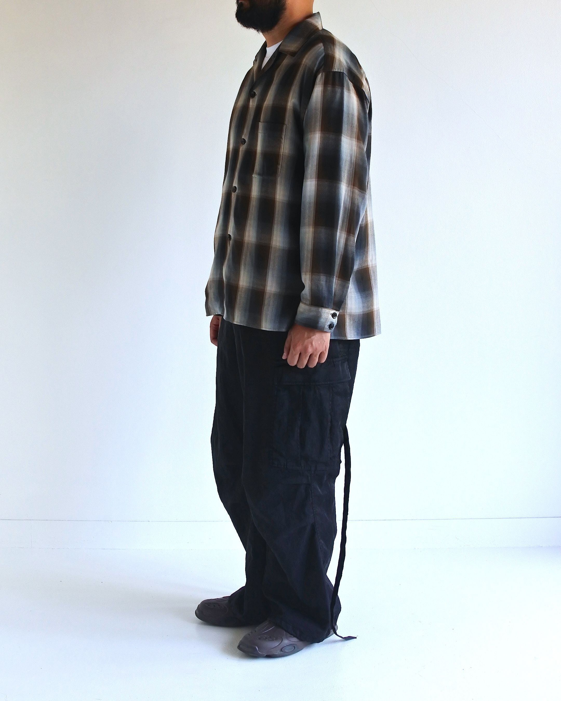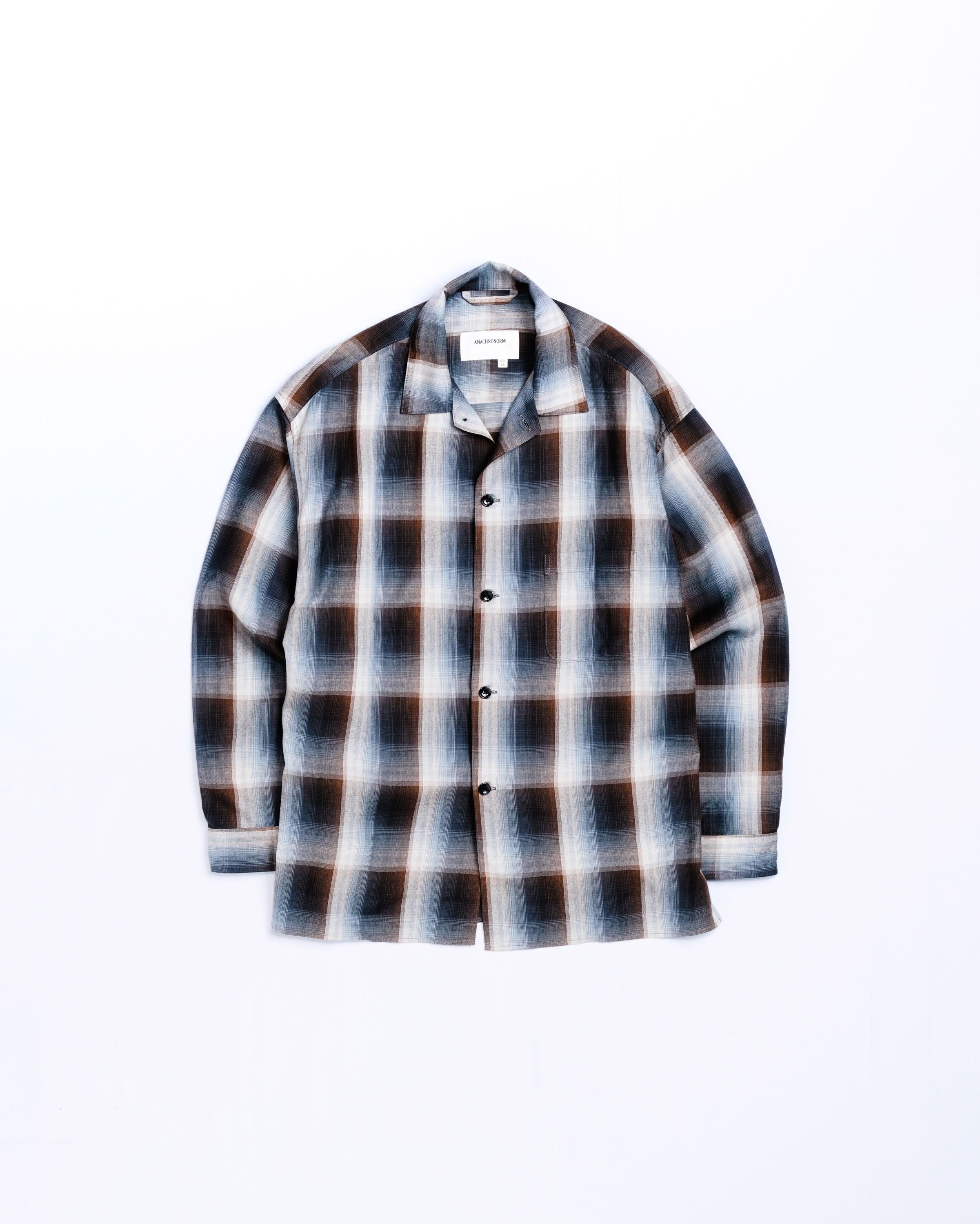 オンブレチェック柄のオープンカラーシャツ。 生地の持つ自然なドレープ感を活かし、ゆとりのあるシルエットに仕上げています。