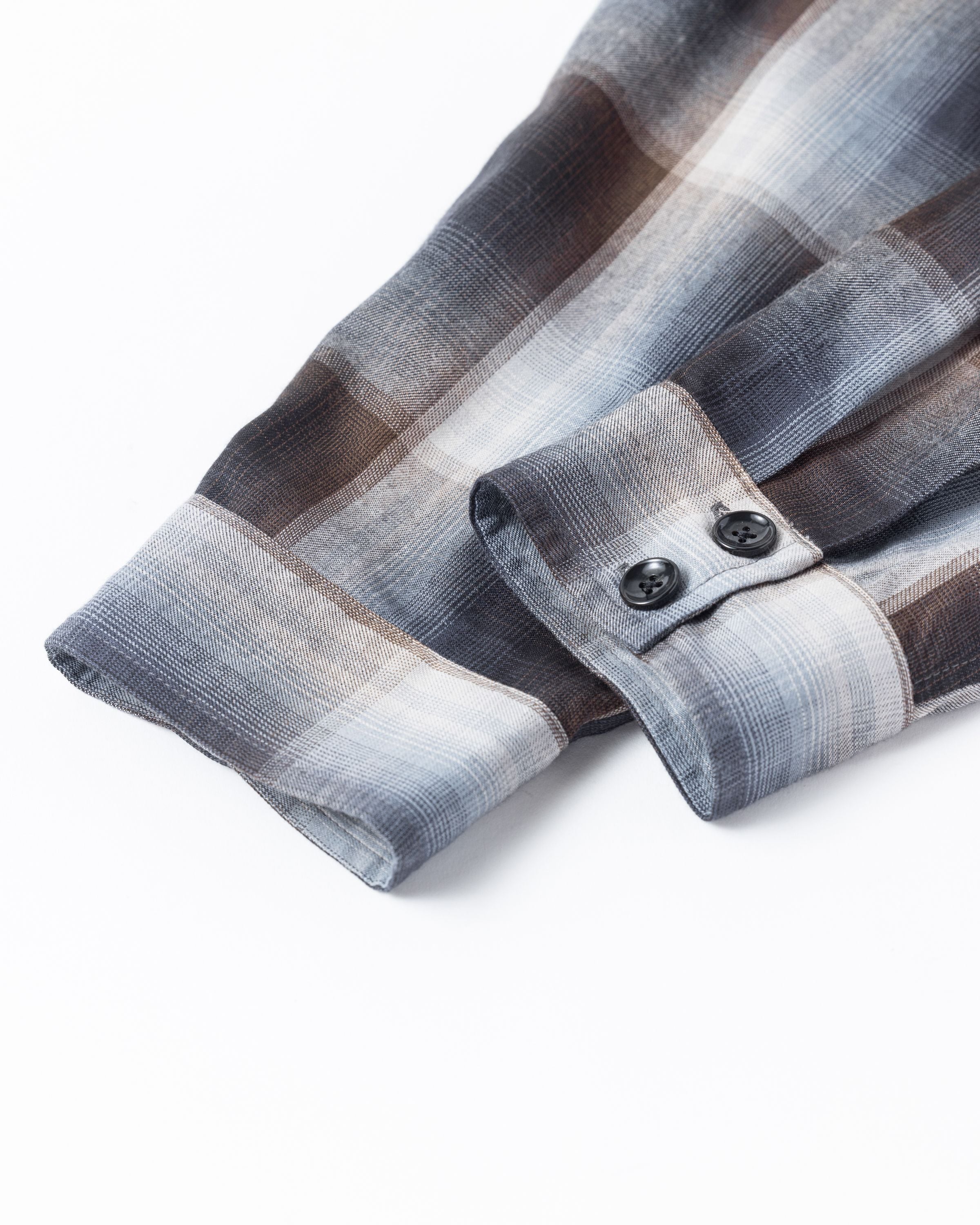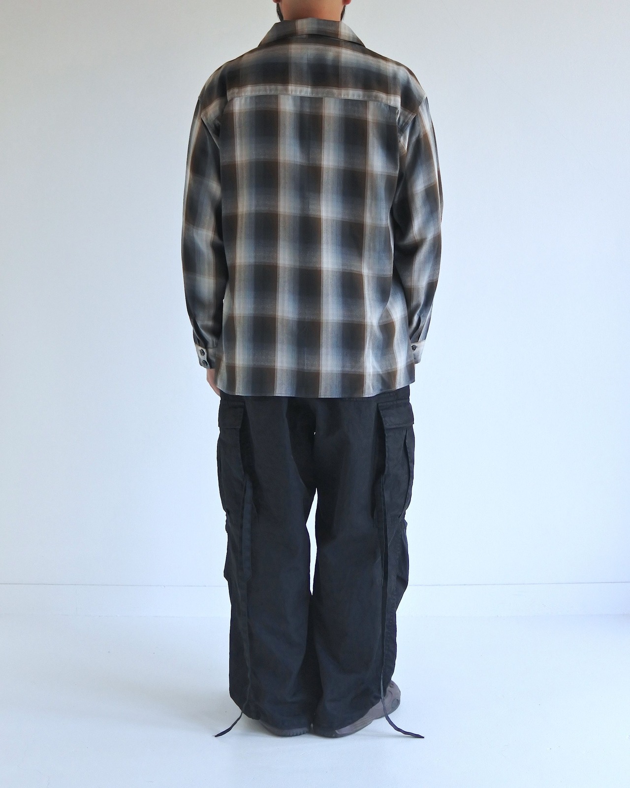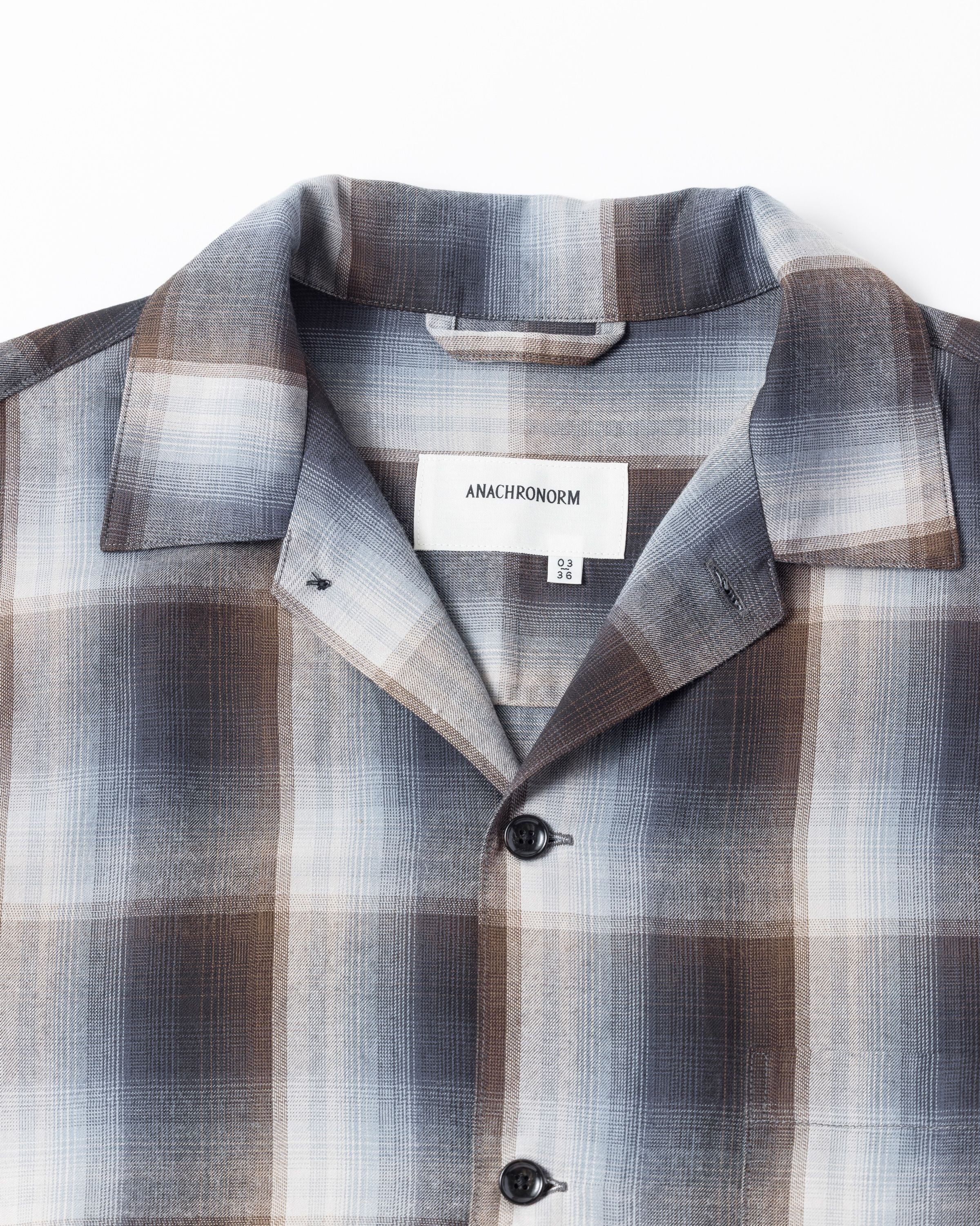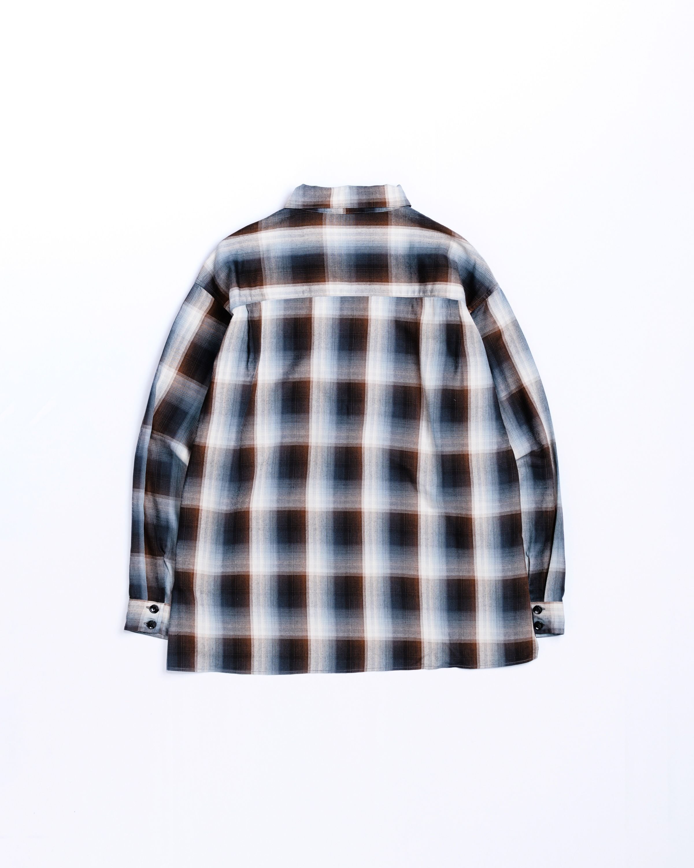 オンブレチェック柄のオープンカラーシャツ。 生地の持つ自然なドレープ感を活かし、ゆとりのあるシルエットに仕上げています。