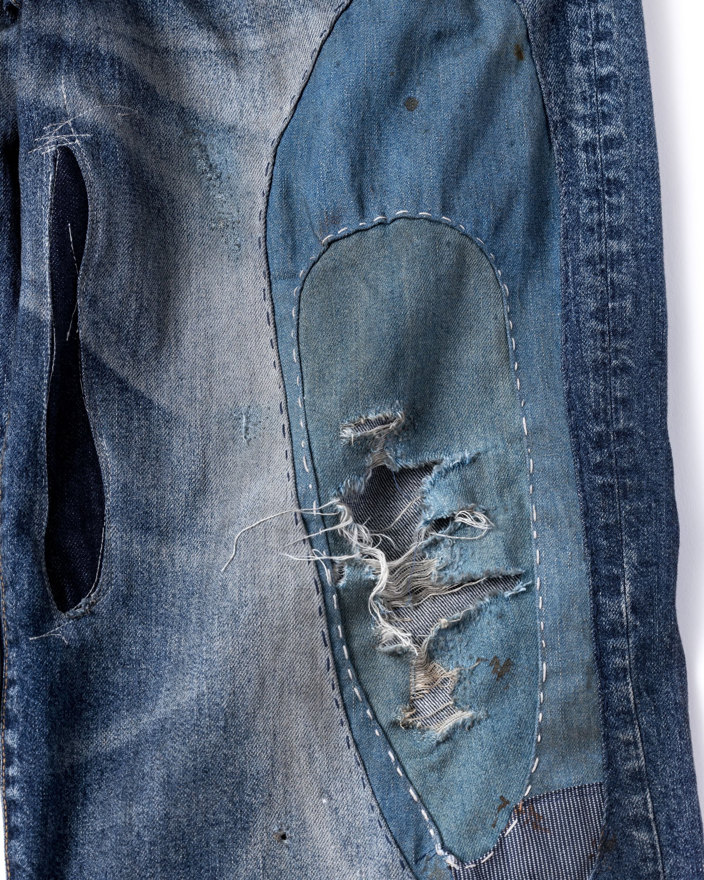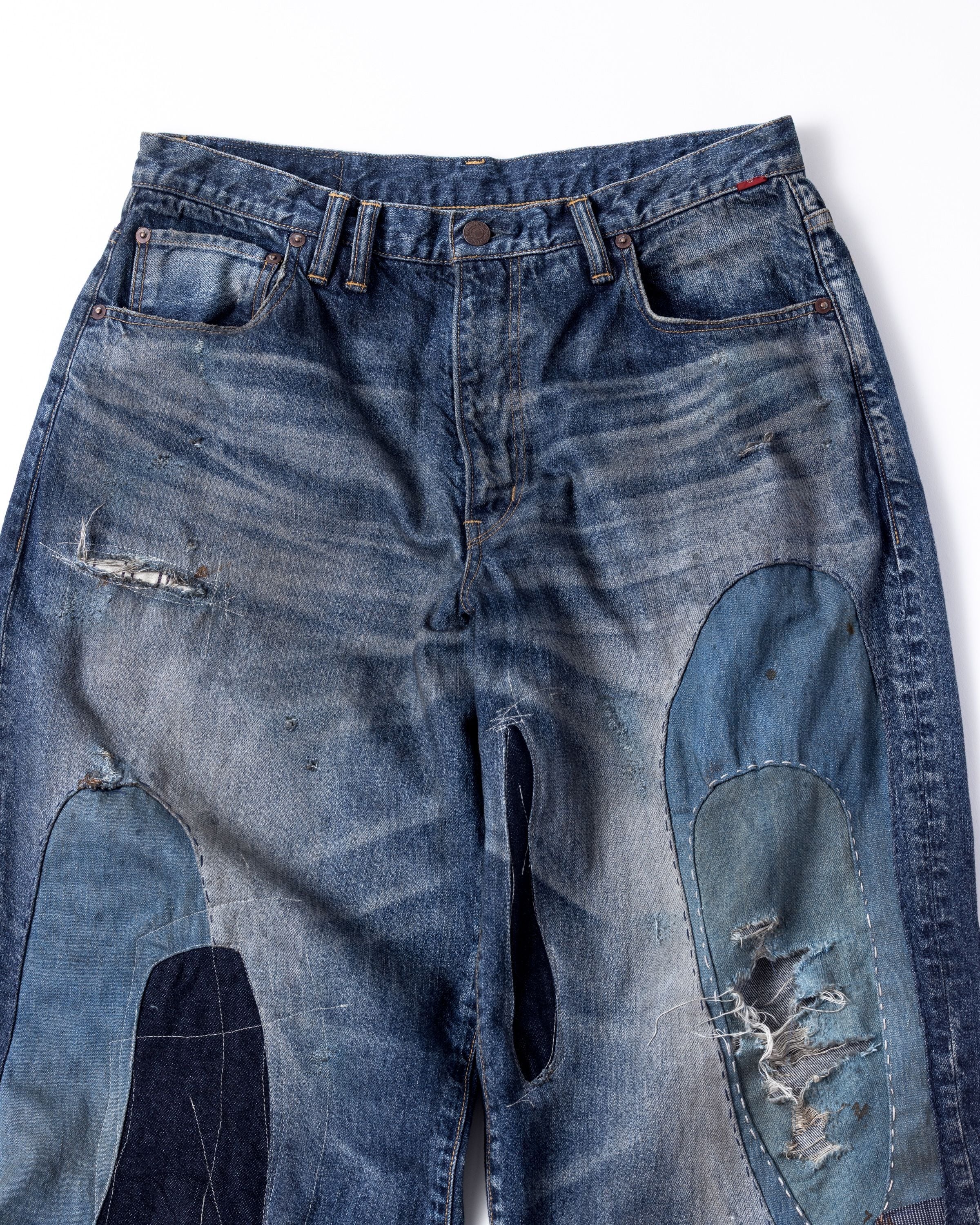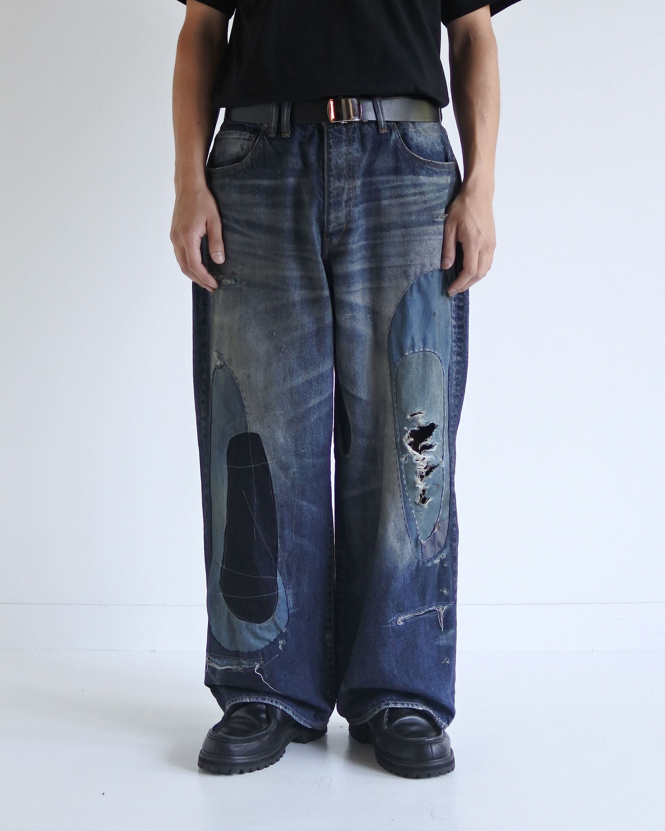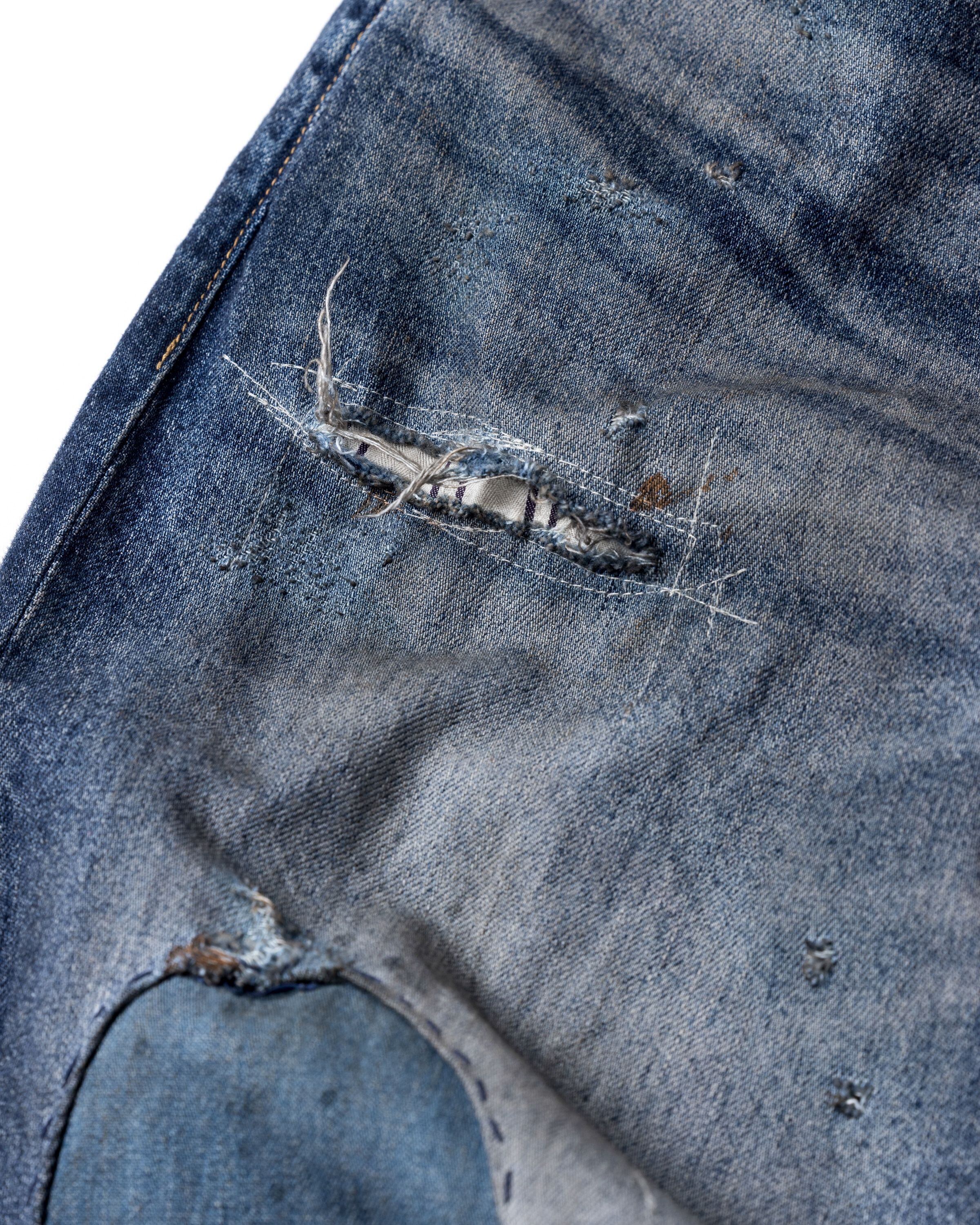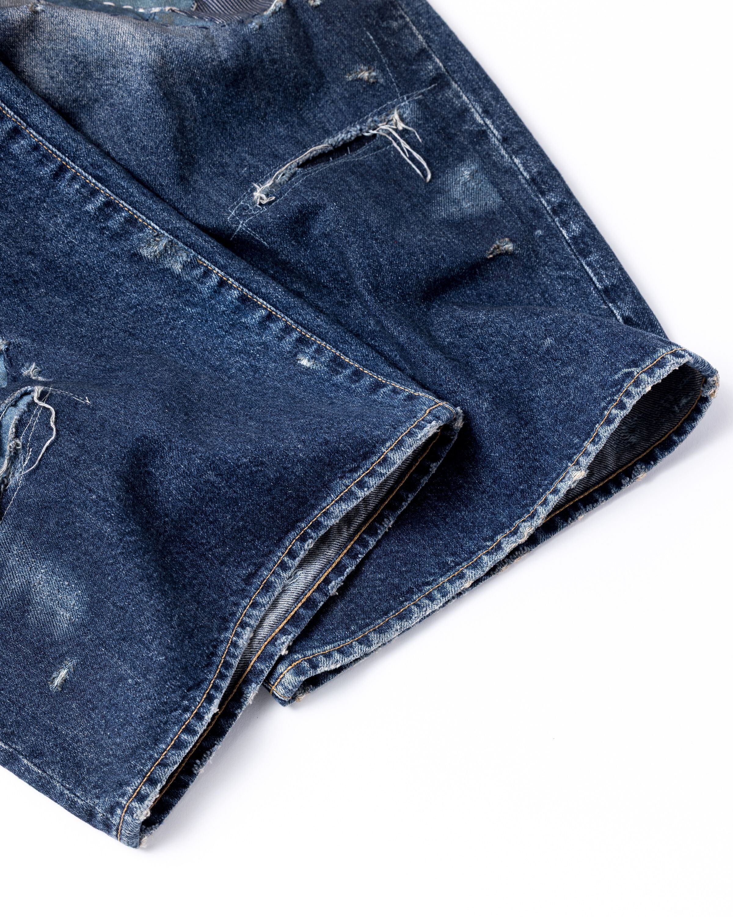 全体的に濃色エイジングとブリーチ加工で仕上げ、随所に激しくダメージを施し複数の当布でパッチワークリメイクしております。